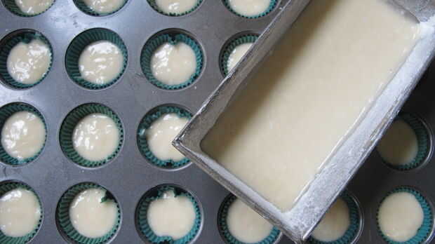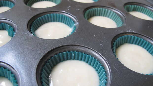 5. llenar papeles pintados/capa alrededor de la mitad a dos tercios llena. También verter la masa restante en molde de pan mini. Hornear durante unos minutos de 21-25, pan pan lo más probable es tomar al menos 5 minutos más. Comprobar con un palillo para ver que si se hacen, si el palillo sale limpio, está hechos! Dejan enfriar.