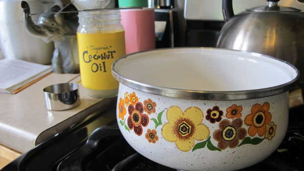 3. derretir el aceite de coco 1/4 de taza en una cacerola pequeña a fuego bajo. Una vez derretido, apagar el fuego, deje pan en la estufa por lo que permanece agradable y melty.