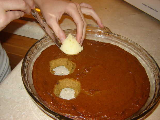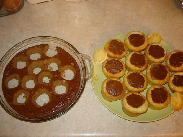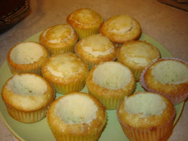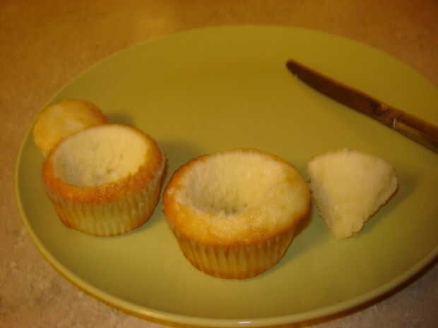 Cuando se haya enfriado la crema, ligeramente Coloque un cono superior cupcake tamaño promedio encima de la natilla y cortar una forma de cono. Pensar que usted está cortando al tener que cortar doce círculos para los cupcakes. Coloque el cono de crema en el orificio de la Magdalena; puede que lo aplasta ligeramente en su lugar.