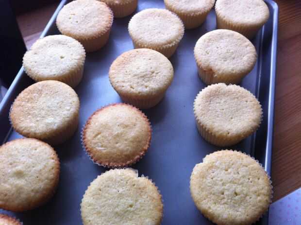 Precalentar el horno a 350 y línea 24 latas de Magdalena. Mezclar todos los ingredientes secos en un bol y reservar. Crema mantequilla y el azúcar hasta ligero y mullido. Mezcle gradualmente en cada huevo, uno a la vez. En otro bol, añadir la leche y la vainilla. Alternas de mezcla los ingredientes secos y la mezcla de leche a la masa de mantequilla en 3 partes. Una vez todo mezclado, se dividen en latas cupcake, llenando 3/4. Hornear durante 20-25 minutos hasta que esté listo.