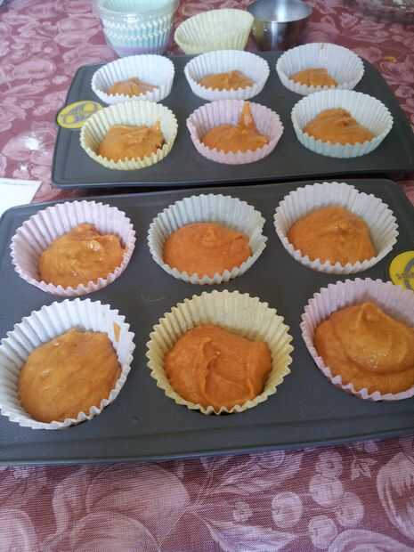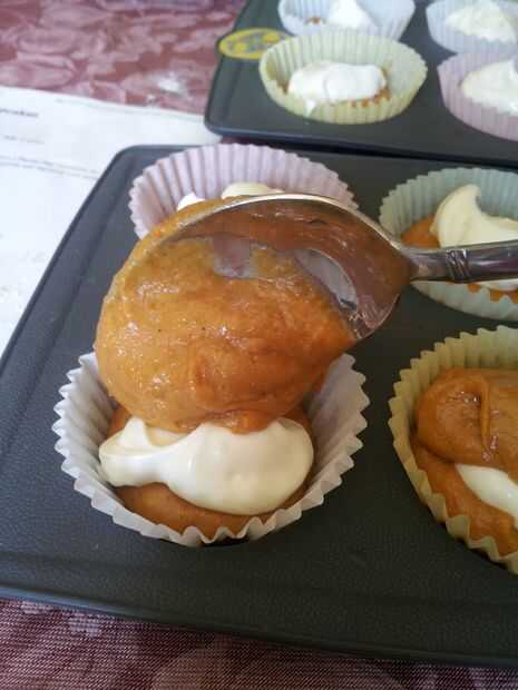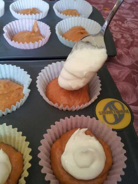 Hornee a 350 durante 25 minutos, hasta que las tapas son elásticas. puede cubrir con glaseado de queso crema o comer como es. Son deliciosos de cualquier manera.