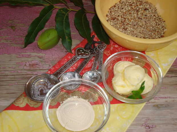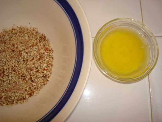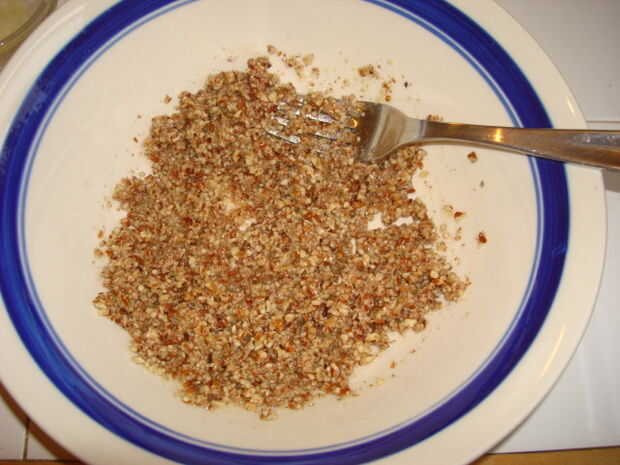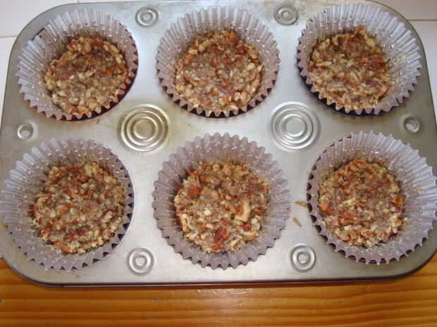 Vierta una pequeña cantidad de la mezcla de nuez en cada taza. Uso just lo suficientemente para la corteza inferior. Es posible que observe la imagen de la Magdalena sin el forro... que uno tenía demasiada corteza creo.