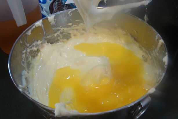 -romper los huevos en un recipiente separado y ligeramente golpeaban juntos, agregar lentamente a la mezcla de queso crema, batiendo totalmente