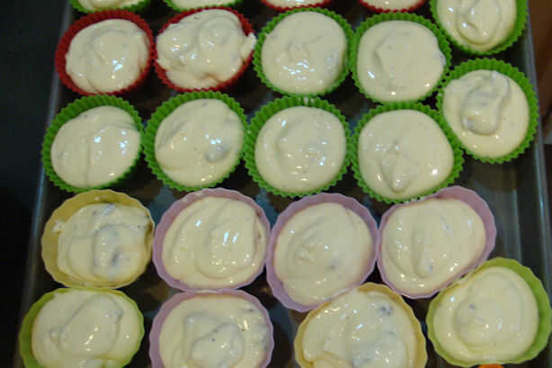 Precaliente la horno a 275 grados. Línea estándar muffin latas con silicona. Coloque una galleta en el fondo de cada copa.