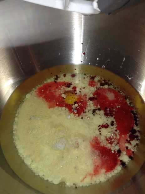 Paso 3: En un recipiente aparte, Combine aceite, Buttermilk, huevos, colorante, vinagre y vainilla.