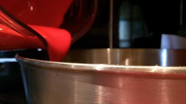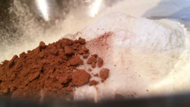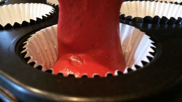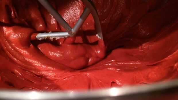 Comienza batiendo la mantequilla y el azúcar juntos durante 2-3 minutos, añadir el huevo y batir otra vez. Mezclar la harina, cacao, sal y polvo de hornear. Tamizar la mitad de la mezcla a la masa y batir durante 2 minutos. Añadir el alimento rojo colorante en el suero de leche y mezcle antes de echarlo a la mezcla. Tamizar la mezcla de harina restante y bata a velocidad media durante un minuto. Para terminar, añadir el vinagre al bicarbonato de sodio y mezcla a la masa. Vierta la mezcla en casos de Magdalena y hornear a 175 grados centígrados para 18minutes.