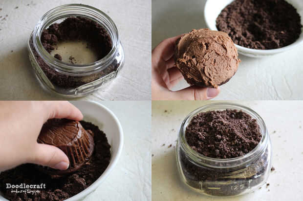 Vierta algunas migas de galleta de chocolate en un pequeño tarro de masón.