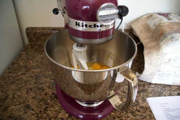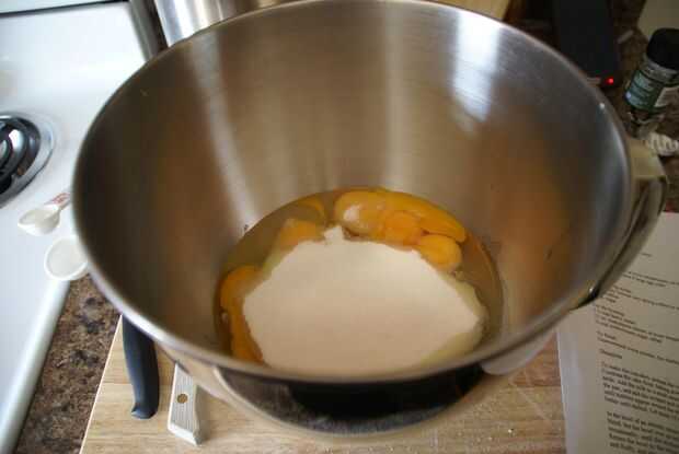 1. En el recipiente de una batidora eléctrica o con una batidora de mano, combinar los huevos, las yemas de huevo y azúcar. Bate ligeramente para mezclar.