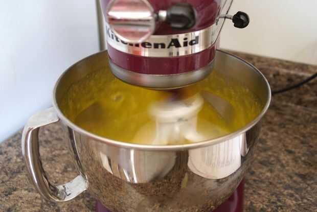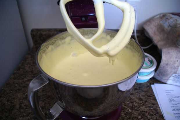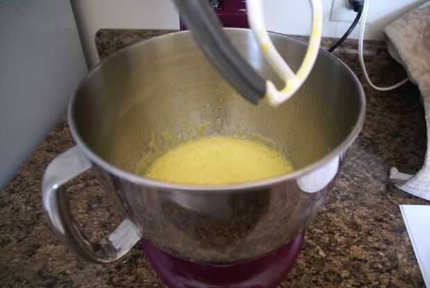 3. Retomar el tazón de fuente del mezclador base y bata a velocidad alta hasta que la mezcla es un pálido amarillo y esponjoso. Sabemos que se hace al levantar el batidor y la mezcla es capaz de sostener una cinta o pico suave.