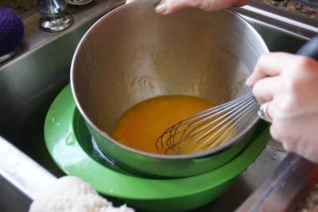 2. Coloque el recipiente sobre un tazón de agua caliente, batiendo de vez en cuando, hasta que la mezcla está caliente y el azúcar se disuelva, unos 6 minutos.