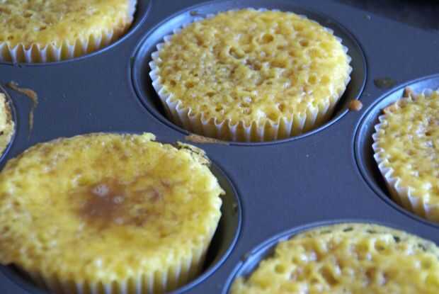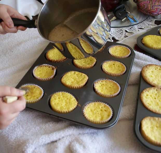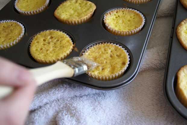 2. Coloque sus magdalenas calientes hacia fuera en la mesa debajo de un paño y usando un pincel de repostería, cepille la parte superior de los cupcakes con el líquido empapando. Repetir hasta sumergirse líquido se utiliza para arriba.