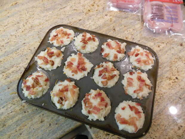 y ahora la pièce de résistance: tocino. Para mis ingredientes había utilizado bacon y salsa o queso fundido podría ser utilizado como un baño agradable con el tocino picado. Una vez que estés satisfecho, puede hornear sus magdalenas.