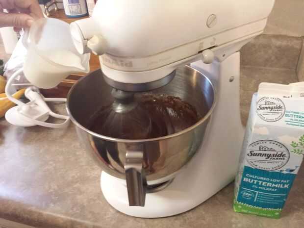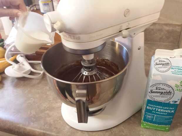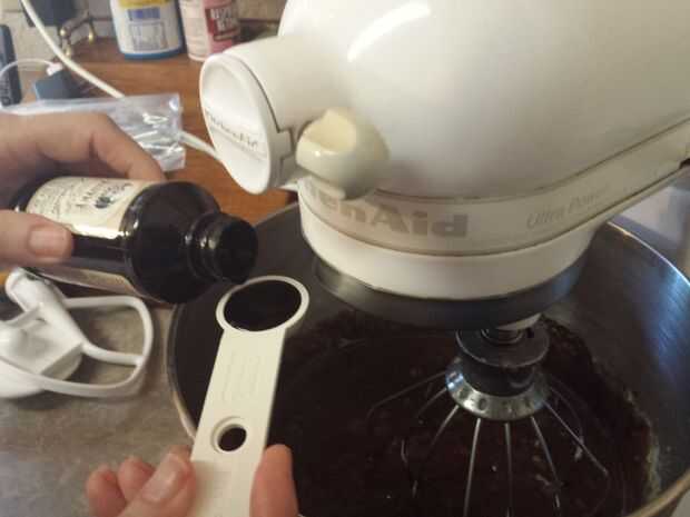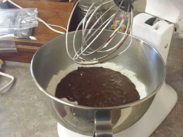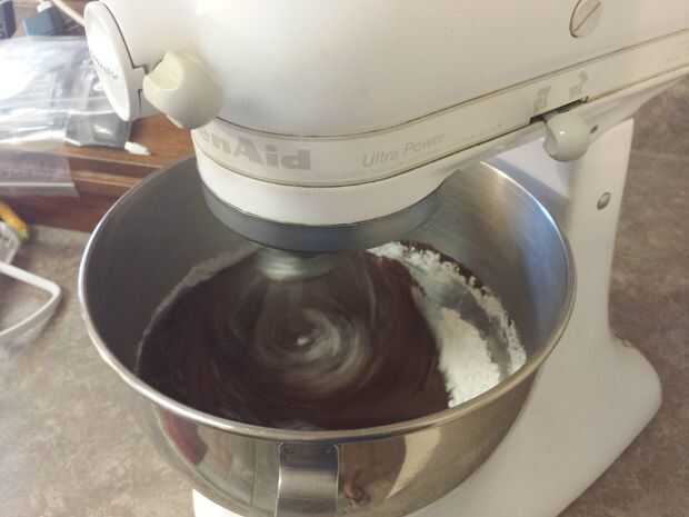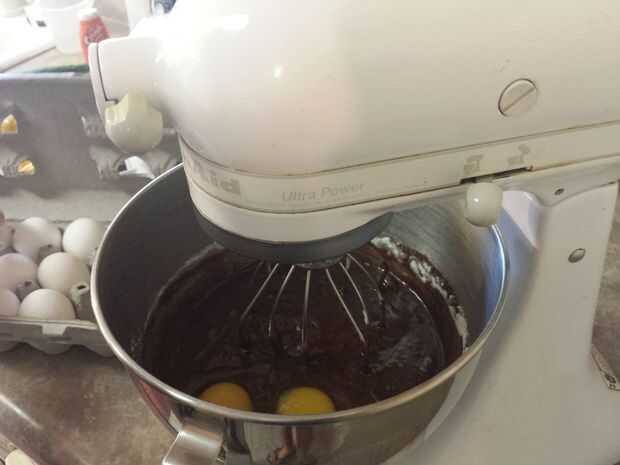 Vierta con cuidado la mezcla de chocolate caliente en su mezclador que tiene los ingredientes secos mezclados en el mismo. Encienda el mezclador en velocidad baja para comenzar mezclando; Mientras esto ocurre, agregar 2 huevos, 1/2 taza de mantequilla y 1 cucharadita de vainilla. Continúe batiendo hasta que los ingredientes aparecen completamente combinados. Asegúrate de raspar los bordes de la taza (mientras la batidora esté desconectada, por supuesto... seguridad primero!).