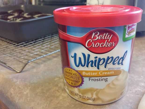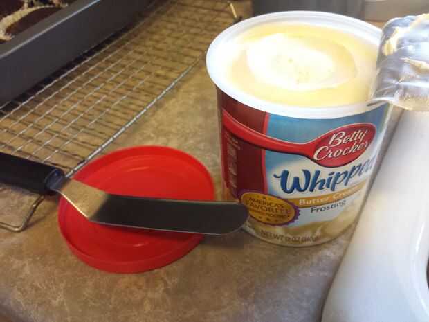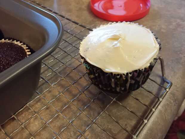 Una vez que sus magdalenas ya cocidos y están muy bien, podrás poner en una capa delgada de escarcha para ayudar a que el fondant se adhieren a ella en el siguiente paso. Realmente no importa qué tipo de helar utilizas; Utilizamos escarcha comprada ya que era mucho más simple que tener que limpiar nuestro mezclador para hacer helar desde cero. Aplicar una capa fina un poco de frosting para el cupcake, asegurándose bien la capa y tratar de hacerlo tan plano como sea posible.