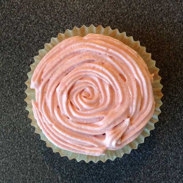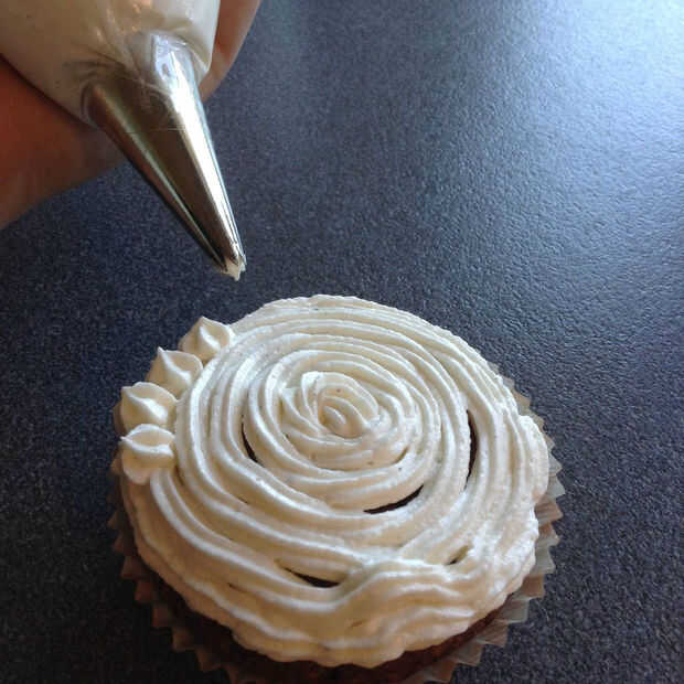 2. hice pequeños rosetones en la parte superior sujetando la Manga pastelera perpendicular a la Magdalena cerca de la cubierta y presionando firmemente, luego soltando la presión y elevación.