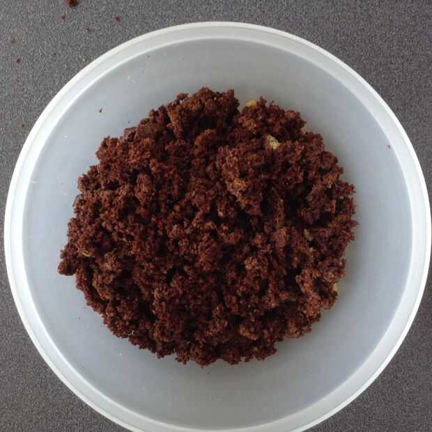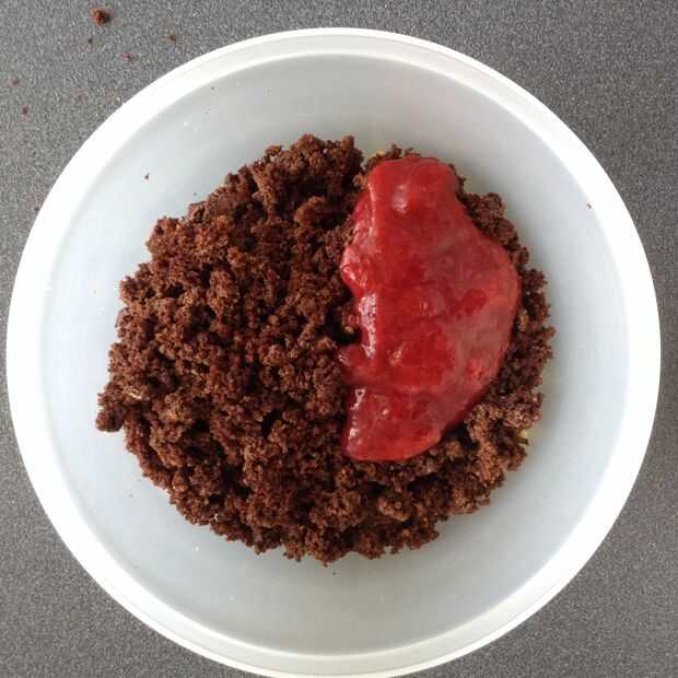 Se desmoronó el 12 cupcakes, 6 vainilla y chocolate 6, en un bol, y luego he añadido algunos cotos de fresa, algunos cacao extra porque la mitad de los cupcakes eran de vainilla, un poco de azúcar extra y el aceite y algunos vainilla y koriander para sabor. Cuando yo era feliz con el sabor, he añadido algo de zumo de manzana para humedecer la masa suficiente para estar en forma de bolitas. Sin embargo, añadí demasiado jugo, así que tuve que agregar que algunos machacado galletas/cookies también.