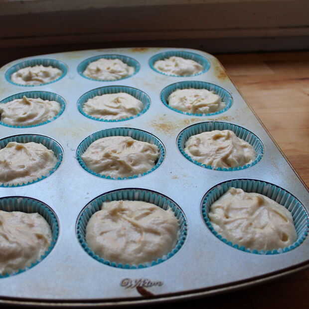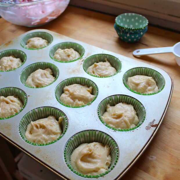 Línea una lata del mollete con los trazadores de líneas y llenarlos! Los trazadores de líneas casi todo el camino hasta la parte superior de llenado resultará en tapas más planas, más ancha de la Magdalena, que son grandes para decorar, pero no tan bonita. Los trazadores de líneas 2/3 del camino completo de llenado resultará en cupcakes cute, redondeados. Así que ir con lo que sea bueno que te gusta.