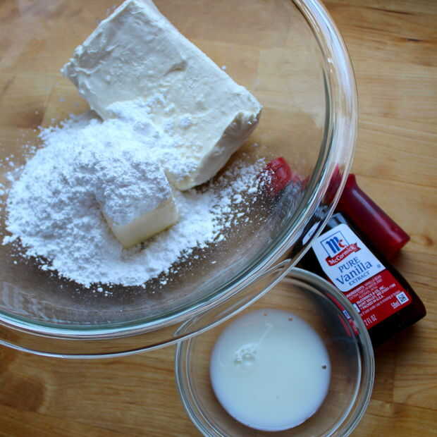 Bata el queso crema, vainilla, 1 cucharada de la leche y la mantequilla hasta agradable y suave, añada el azúcar y mezclar hasta combinar bien.
