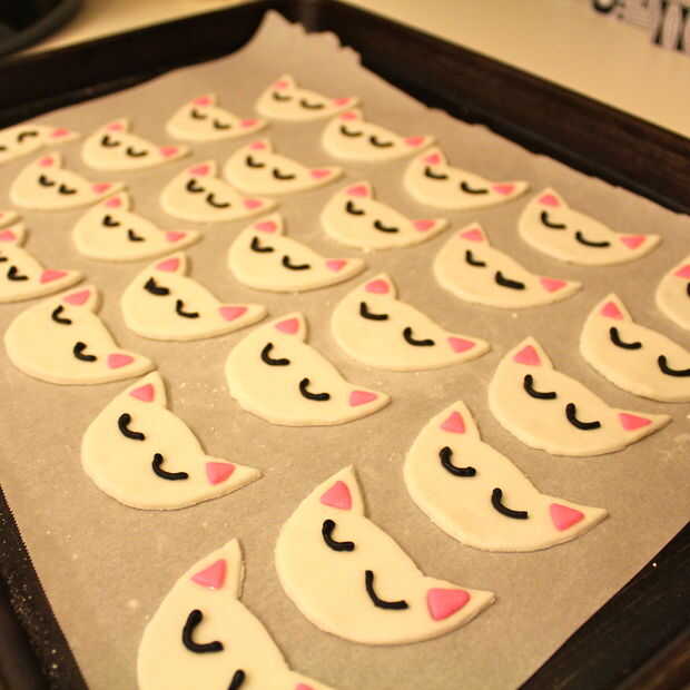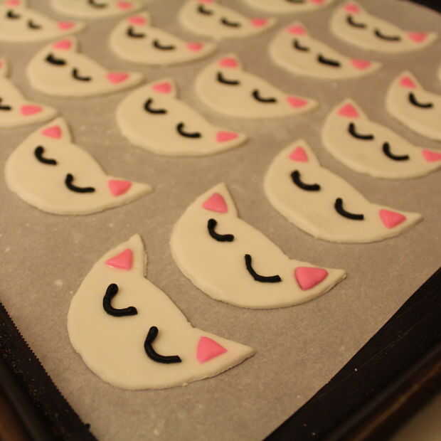 Para colocar los triángulos, conseguí un cuenco de agua y utiliza un laminado en toalla de papel para dab un poquito de agua en las orejas de gato y luego presiona el triángulo rosa en su lugar en la parte superior. Asegúrese de no utilizar demasiada agua! Me pareció que un par de pinzas útil aquí.