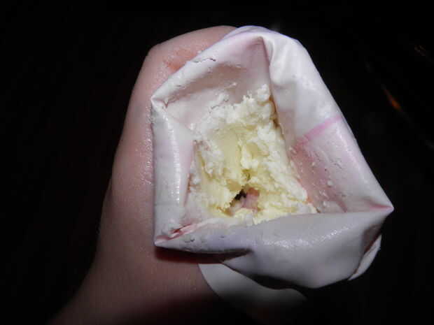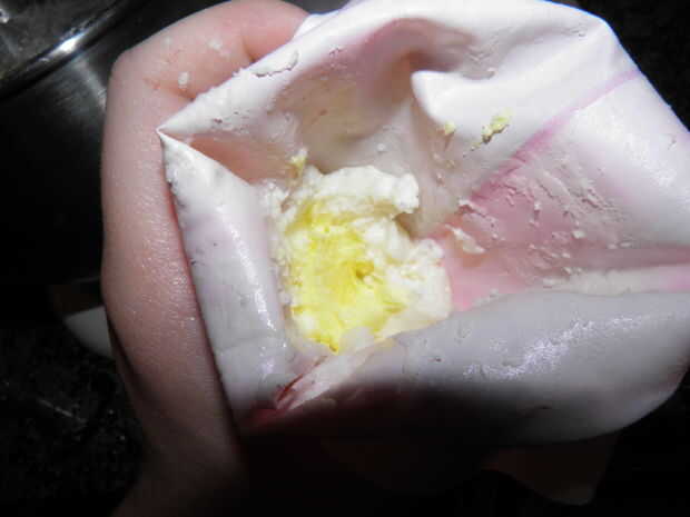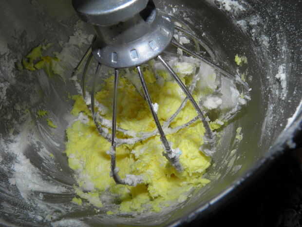 3. poner el glaseado blanco alrededor de los bordes de la bolsa. Luego agregar el colorante amarillo a la batidora y hacer helar amarillo. Agregar al centro de la bolsa.