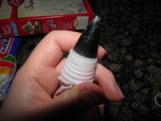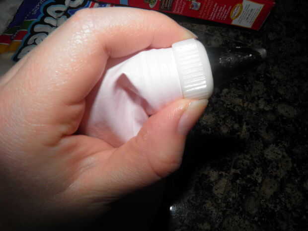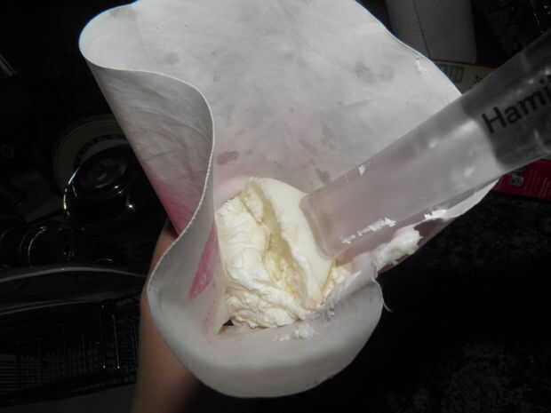 3. para llenar la bolsa, simplemente use una espátula de goma para poner el glaseado dentro de la bolsa. Apriete el glaseado hasta la punta de la bolsa y torcer el resto de la bolsa. No llene la bolsa más de la mitad!