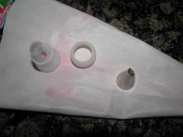 2. Ajuste la bolsa puede ser confuso. Utilizar las imágenes con notas para ayudarle. Poner la parte más grande del acoplador dentro de la bolsa y empújelo hacia abajo para la punta de la bolsa. Luego aplica la punta de wilton de fuera de la bolsa. Por último, atornillar la otra parte del acoplador para mantener la punta en su lugar.