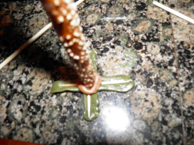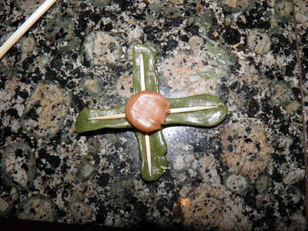 8. corte un trozo pequeño del tootsie roll y prensa en el centro de cada una de las cruces.