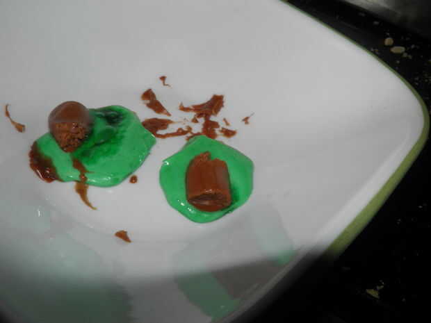 1. Tome dos verde ahora y más adelante dulces y poner en un bol. También tomar un rodillo del tootsie, rasgar por la mitad y poner cada mitad sobre una de las ahora y posteriores.