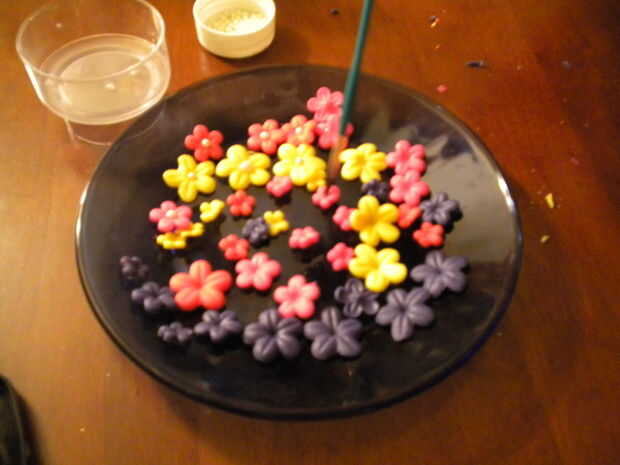 Tomar la pasta de azúcar y usar gel de color de alimentos y mezcle bien. Rodillo fondant fina y cortar con cortadores de galleta pequeña. Usted puede hacer cualquier forma que desee, opté por hacer las flores. El centro de las flores es perlas comestibles. Usé pegamento de pastillaje para añadir las perlas.