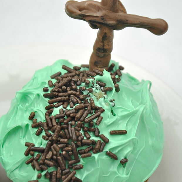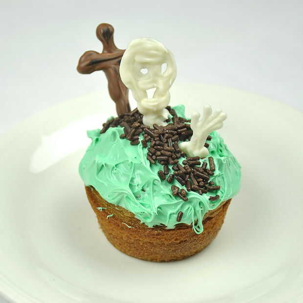 este divertido cupcake Halloween tiene tres diferentes componentes-la suciedad, la mano de esqueleto y la lápida.Me inspiré en un producto que vi en Amazon, un plástico mano esqueleto en forma de recoger y pensé wow-puedo hacer que la mano comestible