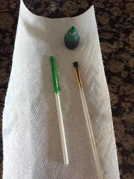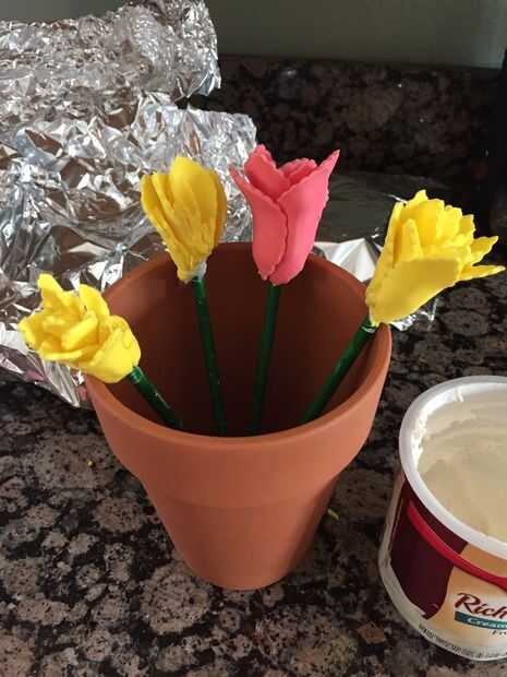 -Pintar un colorante de caramelo pop palo verde con alimento verde. Que el palo de secar al aire (10-15 minutos) y luego con cuidado lodge el palillo en la base de la flor. Es mejor hacer esto mientras que la flor es aún flexible. Retire el palillo de la base de la flor una vez que ha hecho un hueco (aproximadamente 1/2 pulgada de profundidad). Coloque algunos helar en el agujero y vuelva a insertar el palo. El glaseado le ayudará a mantener la cabeza de la flor en el "tallo".