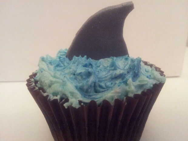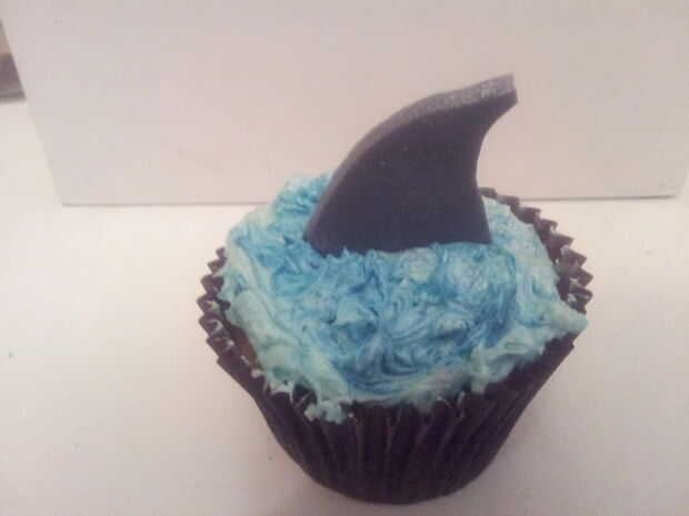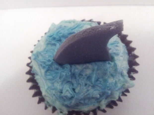 Le doy a mi hijo la mezcla de crema de mantequilla y luego sumergir una horquilla en color gel azul alimentos, mezcla la horquilla redonda allí que parece darle perfectas rayas que parecen agua. Luego con un cuchillo extienda la crema de mantequilla coloreada en la parte superior de las tortas, con el tenedor para esponjar las cosas un poco si es necesario. Luego basta con pulsar una de las aletas de tiburón vertical en la parte superior de cada una de las tortas. También tengo una plata lustre spray y dar todo un spray rápido con que para hacer las olas brillan.