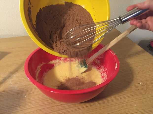 Paso 8: Mezcle los ingredientes secos y 1/2 taza de crema entera alternativamente en la mezcla líquida en el recipiente grande con una espátula de goma.