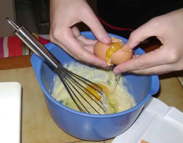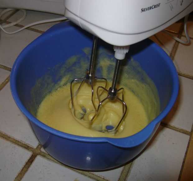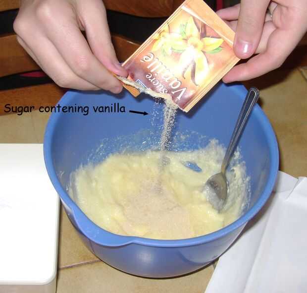 Ahora, usted puede empezar! Batir el azúcar con la mantequilla ablandada y añadir 2 paquetes de azúcar de vainilla contening. Mezclar y añadir 2 huevos.