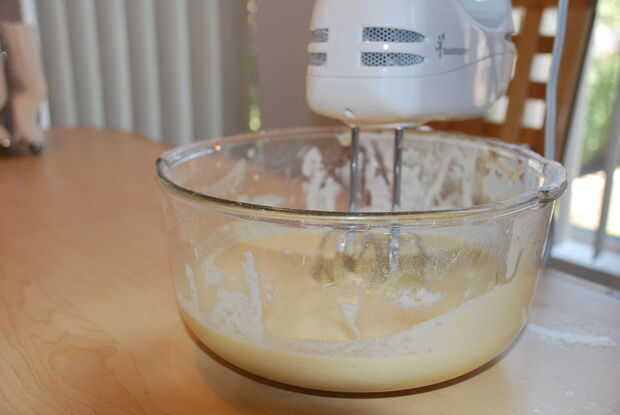 Por último, mezclar en la harina y la leche poco a poco y batir hasta combinar bien.