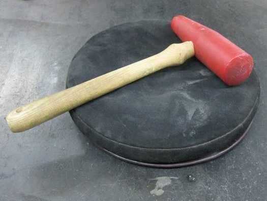 En la mesa de trabajo fue una bolsa de arena que se asemejó a una almohada de tiro redondeada pequeño, pero lleno de arena.  Después de hacer una mella en la bolsa con mi puño, coloqué el borde del disco de aluminio en la bolsa y comenzó a golpear con una especie de un golpe de refilón con martillo de plástico, alrededor de una pulgada de la circunferencia. Después de recorrer todo el camino, comencé en el centro y trabaja hacia fuera en espiral.  En este punto, tuve una fea pieza abollada con cierta curvatura que se deforme en forma de taco shell.  El aluminio fue consiguiendo trabajo endurecido, también.