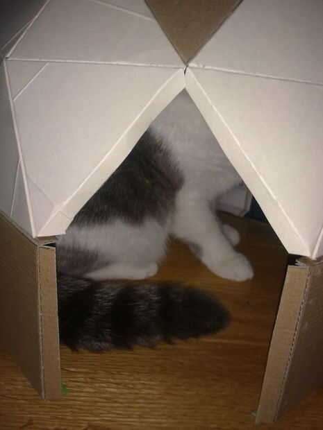 Nuestros gatos primero caminamos alrededor de él, un valiente finalmente consiguió acogedor en él por la noche. Todavía tengo que añadir algo suave dentro para poner en y pintura todo en cuanto me sale la pintura correcta.