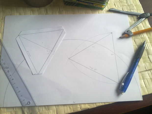 Llamar el triángulo de muestra de ambos tamaños sobre la cartulina o un pedazo de papel y añadir al menos 1 cm aletas en cada lados.