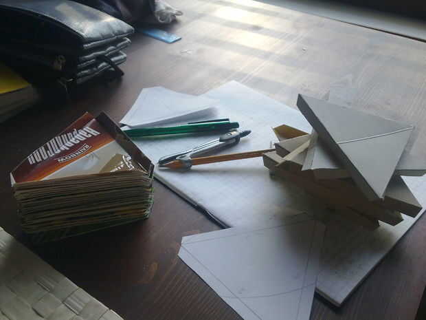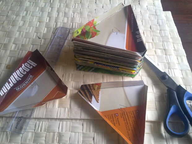Cortar los triángulos y doble las aletas dentro del lado de color, no deseado. La parte trasera de la cerealboxes generalmente no es tan resbaladiza como el frontside impreso y será más fácil pintar a. Cortar los cuadrados también, ahora que estás en él.