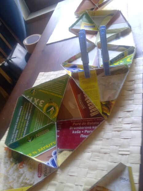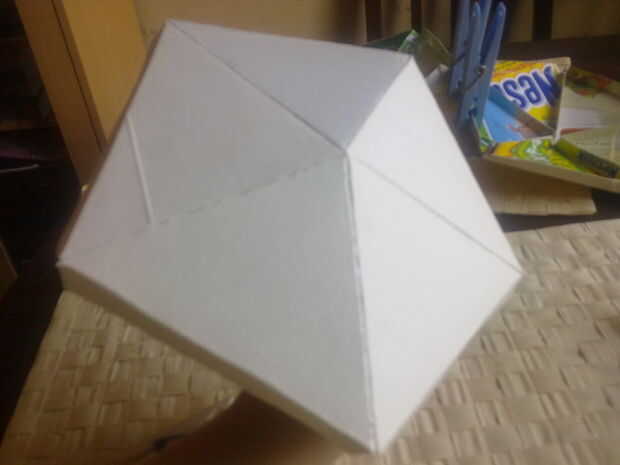Los pentágonos acabados el piso extremo hacia abajo y empezar a pegar BBB-triángulos para les juntos la línea de la parte inferior de la línea. No pegan todos los huecos, dejar hacia fuera para formar la puerta.