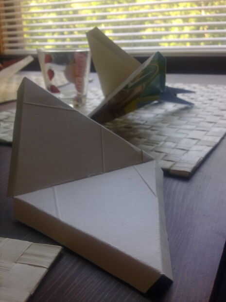 Para evitar el crookedness feo al pegar el último triángulo en y el centro del Pentágono apareció, encontré que forma más sencilla de evitarlo es pegar los primeros 2 y otra 3 piezas juntos primero, luego pegan juntos.