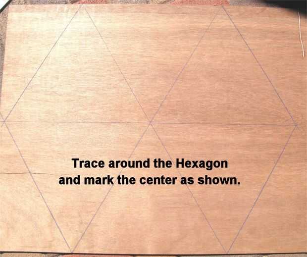 Coloque uno de los hexágonos en la piel de la puerta y trace una línea alrededor del hexágono para obtener una forma de la plantilla sobre la piel de la puerta. Luego marque líneas a partir de los 6 puntos para encontrar el centro.