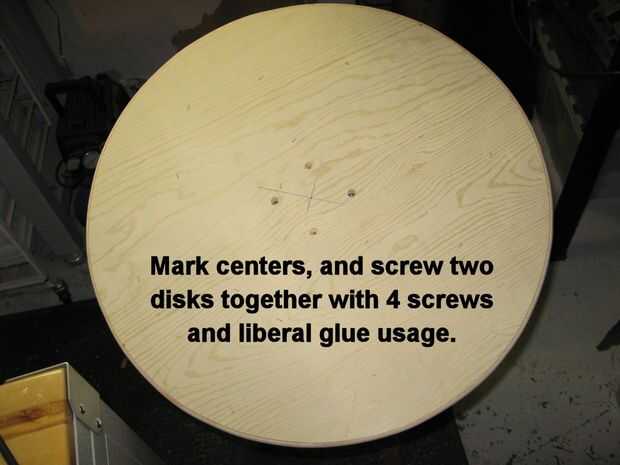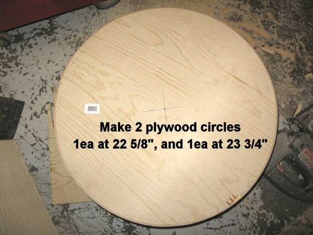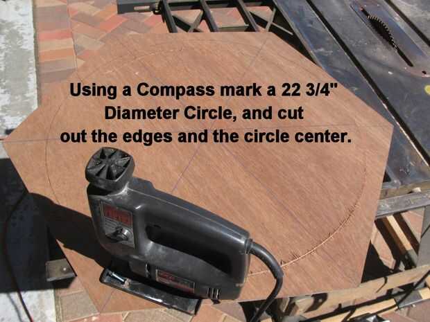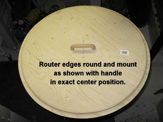 Ahora una puerta está en orden, hacer dos círculos en chatarra planchas de madera, 1/2" a 3/4" densamente, será un círculo 22 5/8" y el otro será 23 3/4" de diámetro, cortar un radio en los bordes externos de cada uno para suavizar un poco la mirada. Enfrentan estos círculos uno contra el otro en los centros exactos (utilizar los orificios brújula para localizar el centro exacto) radio bordes hacia fuera, atornillar los discos y utilizar pegamento liberal. Coloque una maneta en el interior centro de la puerta (el centro del interior será el disco pequeño) tornillo en su lugar desde el exterior (disco grande).