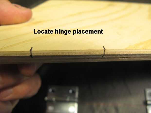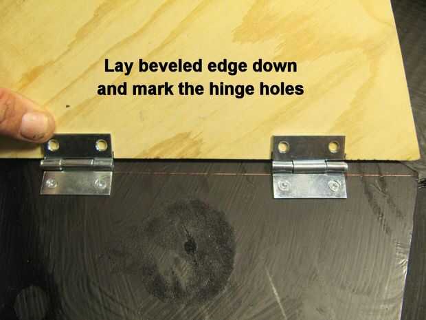 Alinee las bisagras y marque los orificios de perforación. Perforar y montar las bisagras de dos piezas de madera, una vez que los agujeros se perforan y se determina el ajuste que puede Destornillar la 2da pieza de madera y la pintura a la altura que es difícil de pintar esta pieza cuando se monta en la pared.