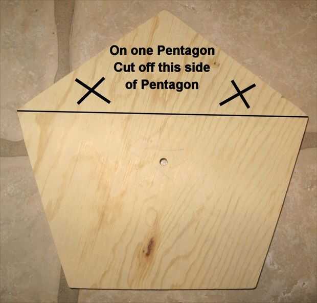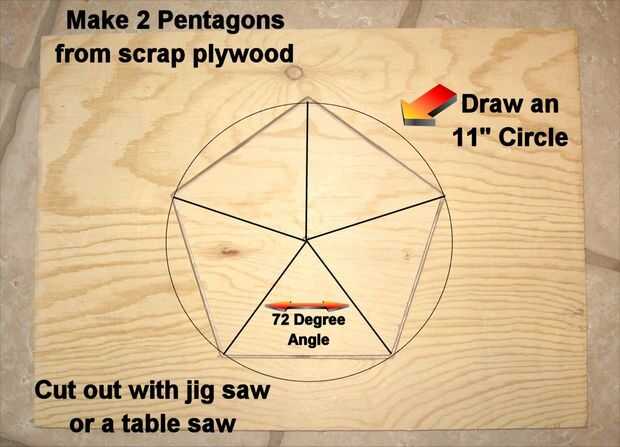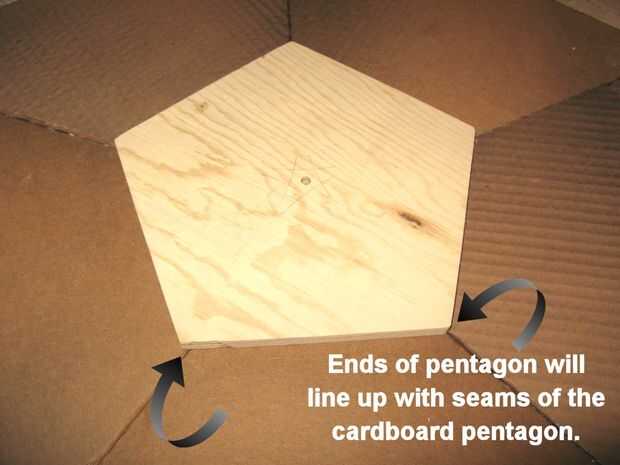 Sacar 2 11" círculos en cada pedazo de madera y comienzo marcado grado 72 secciones para hacer una común forma de Pentágono, una brújula ayudará enormemente con este paso y que también marca el punto central, así, usted necesitará perforar un agujero de 1/4" a través del centro de un pentagon completo punto a esta última añadir aislamiento de la espuma.
