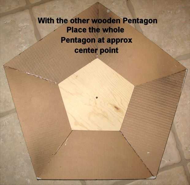 Tomar la pieza del Pentágono completo y pone en uno de los pentágonos de cartón como se muestra en las fotos, se alinee los puntos de madera del Pentágono con las costuras de la cartulina del Pentágono y probar y ajustar en el centro.
