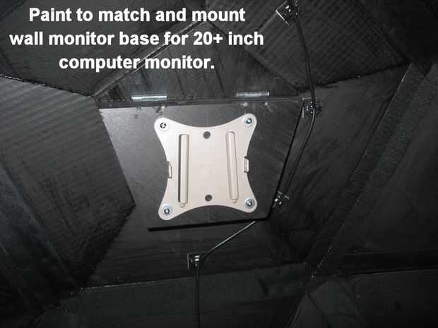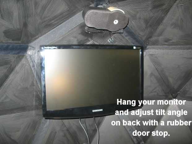 Montar la pantalla del monitor en la pared de la cúpula y para ajustar el ángulo de inclinación se pegue un tope de puerta de goma entre las piezas de madera de montaje de pantalla del monitor, esto le permitirá fácilmente para ajuste del ángulo rápido y sin esfuerzo. Suena bastante simplista - pero imposible de conseguir detrás de la pantalla del monitor después de haber montado para ver cualquier soportes complejos, puede que necesite ajustar, para dejar una puerta de goma funciona mejor y se siente en la oscuridad para hacer ajustes si es necesario.