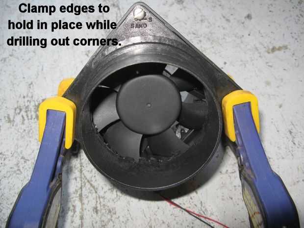 Montar dos ahuecado las rejillas entre cada ventilador y sostenga junto con las pinzas mientras taladra las esquinas para permitir la colocación de perno. Instale los tornillos como se muestra.