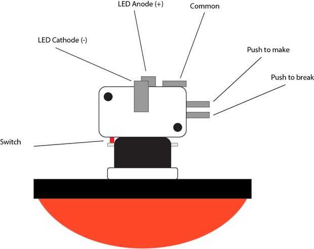 Cuando llegué primero botón de Sparkfun gran cúpula en el correo, estaba un poco confundido. ¿Por qué hubo 5 terminales en un botón y sin hoja de datos? Nunca miedo! Yo he elaborado una guía rápida. Los dos terminales del lado son para el LED. El terminal en la parte superior (si tiene en sus manos el botón hacia abajo, como en la ilustración anterior) es común. Los dos terminales que se pega hacia fuera están para que empujar y empujar para romper. Es probable que sólo debe elegir uno de esos. Utilizando el LED es totalmente opcional y si usted no desea que su LED controlado por un microcontrolador, también apenas podía enganchar encima de una batería que si usted lo desea en constantemente.