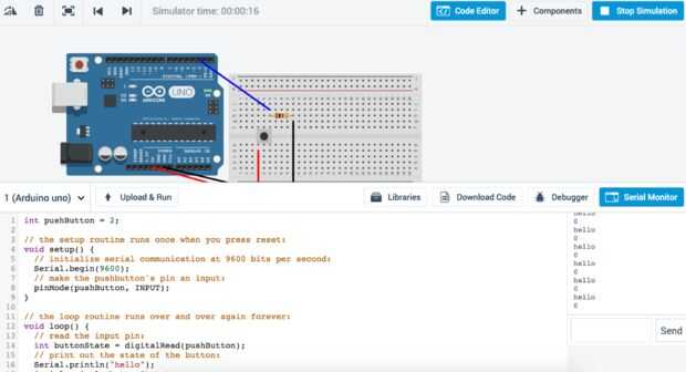 En este ejemplo, lo único que sucede es que "Hola" se imprime en el serial monitor seguida de 1 si se presiona el botón y "0" si no lo es.